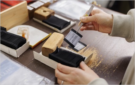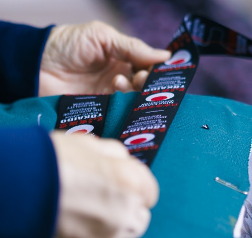 生産した織ネームに、樹脂、ヒートセット、インク止めなどの加工をして防縮やシワ取りなどを行う
