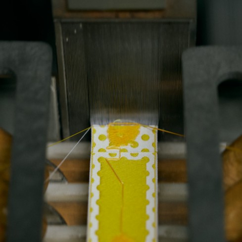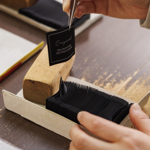 織ネーム用に開発した当組合オリジナルのポリエステル原着糸「FS糸」。原糸製造の初期段階で顔料を混ぜ込むことで、発色に優れ色落ちしにくい特性を実現しました。
